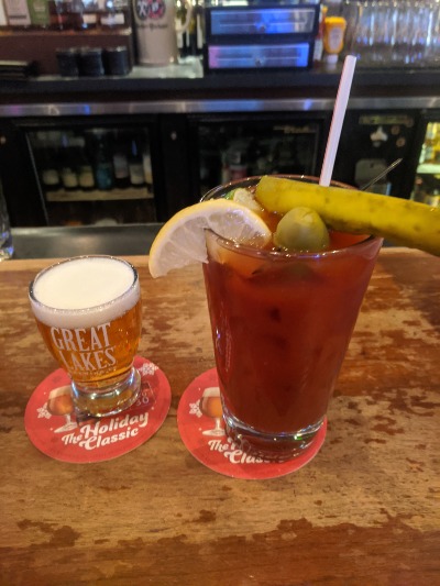 Flannery's joined the Milwaukee bloody mary war with five new bloodies, Essentially their traditional bloody with different salad options, I went with the Cajun shrimp and peppers.